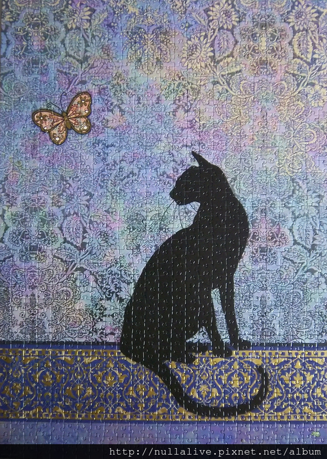 我幾乎不大會買除了喜歡的日本畫家和風景之外的拼圖,不過這花紋和金色的蝴蝶以及優雅的黑貓剪影,讓我看到第一眼就有愛啊><