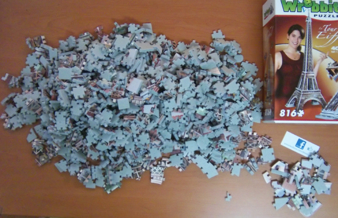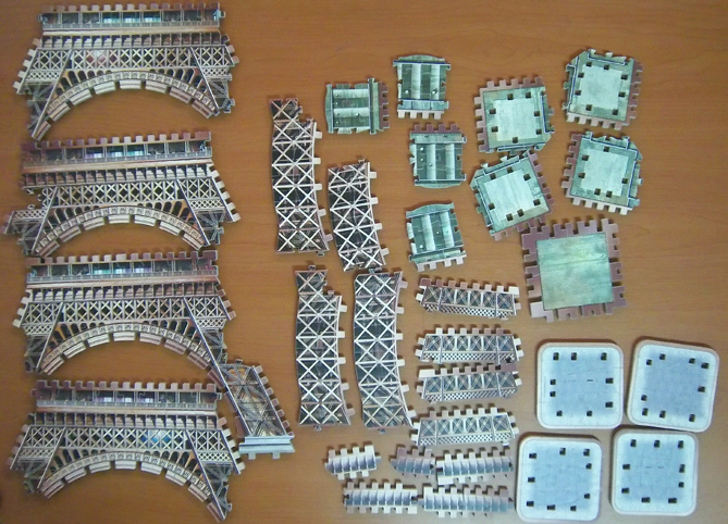 基本上艾菲爾鐵塔這盒並沒有什麼難度,頂多就是拼片形狀是不規則的,因為平面的部份佔絕大多數,所以跟平面拼圖的竅門是一樣的,分類組合就這樣。